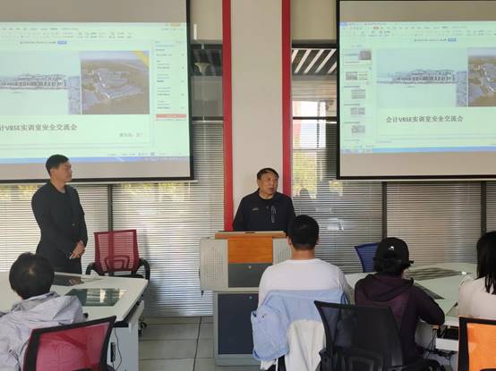 为保证我校会计学专业学生VBSE仿真模拟实训课的顺利进行,进一步提高学生专业实操技能水平,10月19日下午,教务处组织会计系及后勤网络中心相关工作人员在创新创业实验楼三楼实验室召开VBSE仿真模拟实训实验室安全管理交流会,教学副院长于士君、会计系主任刘迪、会计系师生代表参加会议,教务处教学实验管理科吴广主持会议。