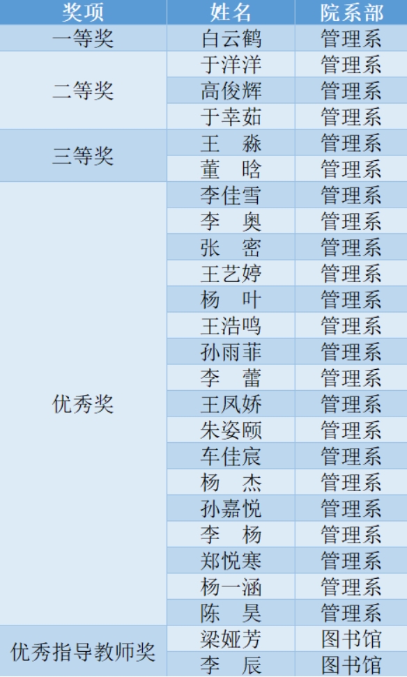 近日,首届“搜知杯”辽宁省普通高校大学生信息素养大赛获奖名单已揭晓,我校共有23名管理系学生在比赛中获奖,其中一等奖1名,二等奖3名,三等奖2名,优秀奖17名;2名图书馆教师荣获优秀指导教师奖。具体获奖名单如下: