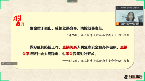 课堂上,任课教师利用多样化的线上平台,以学校统一制作的课件为基础,对本次在庄河市爆发的新冠疫情的发展始末进行了全面的介绍,并结合我校当前的抗疫实际,向学生们讲解了“我国全面加强对疫情防控的集中统一领导”、“国家领导人带领全国人民打好疫情防控的人民战争、总体战、阻击战”、“我们有信心、有能力、有把握打赢这场疫情防控阻击战”三项主要内容。