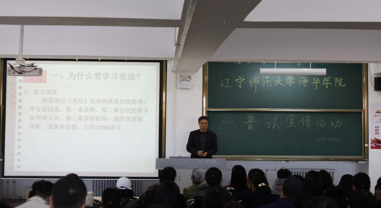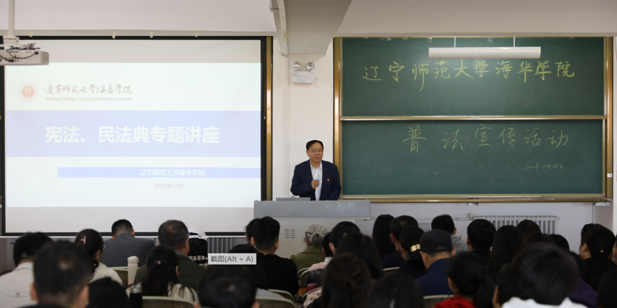 为全面贯彻落实辽宁省教育厅、辽宁省司法厅《关于组织开展2020年度全省教育系统宪法民法典学习宣传教育活动的通知》,增进广大师生对宪法、民法典的理解,10月14日下午,国产一区二区日本在线举行了宪法、民法典专题学习讲座,特邀法律系主任赵晓光教授和吴镇洲老师做了“深入学习宪法,坚定四个自信,为实现中华民族的伟大复兴而奋斗”和“民法典带来的法治新时代风貌”的普法学习讲座,学院领导谷春祥和王树海出席了本次讲座,学院全体党员以及“青马工程”团学骨干培训班学员共同参加讲座。本次讲座由院长助理王树海主持。