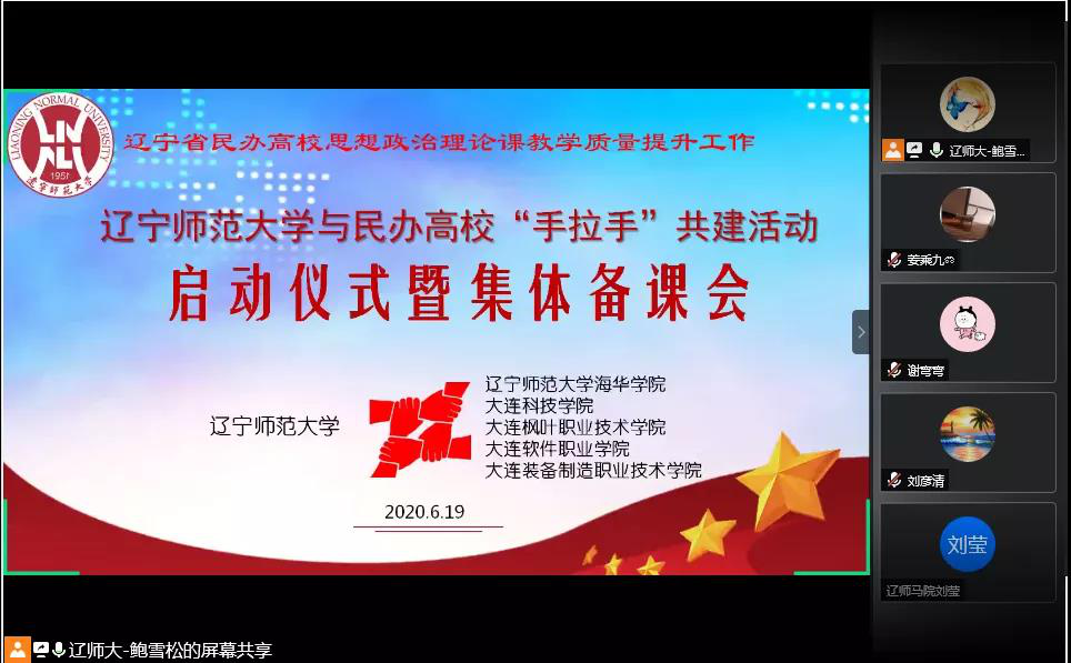 为贯彻落实中共中央办公厅、国务院办公厅印发的《关于深化新时代学校思想政治理论课教学改革创新的若干意见》精神,按照《中共辽宁省委教育工委 辽宁省教育厅关于印发辽宁省民办高校思想政治理论课教学质量提升工作方案的通知》要求,2020年6月19日14:00至15:30,采取网络视频会议的形式,依托腾讯会议平台在线直播,辽宁省民办高校思想政治理论课教学质量提升工作辽宁师范大学与民办高校“手拉手”共建活动启动仪式暨集体备课会成功开展。辽宁师范大学马克思主义学院、我校思政部以及四所院校参加了此次会议。此次会议由辽宁师范大学马克思主义学院副院长鲍雪松主持。