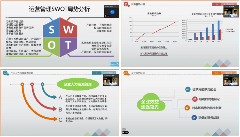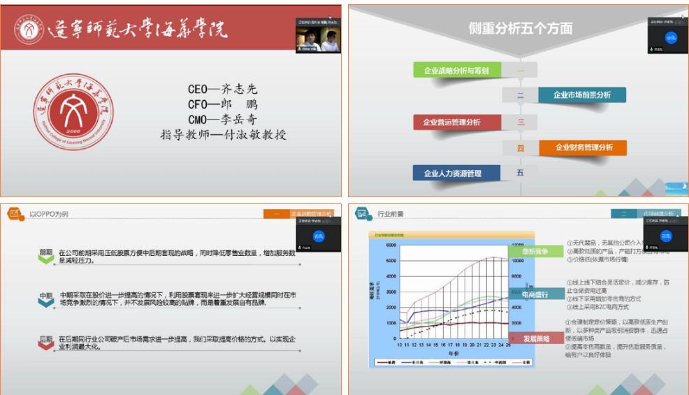 5月20日,省级初赛在大连大学举行。根据省级初赛规则要求,每组队伍的成员须依托商战仿真系统扮演企业的CEO(总经理)、CFO(财务总监)、CMO(营销总监)、COO(运营总监)等角色针对虚拟企业前十年生产资料及财务报告等数据分析虚拟企业经营成果、财务状况及各销售大区供需比,进行对工厂的运作、存货的控制、价格的制定、财务成本的诊断、资本结构和投资组合、销售前景的预测以及正确应对利率、股价的起伏等方面进行线上模拟经营决策。