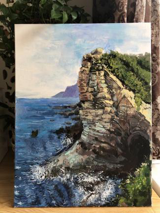 设计说明:此幅画运用丙烯创作,悬岸峭壁、层峦叠嶂,层次分明,遂有感而做。