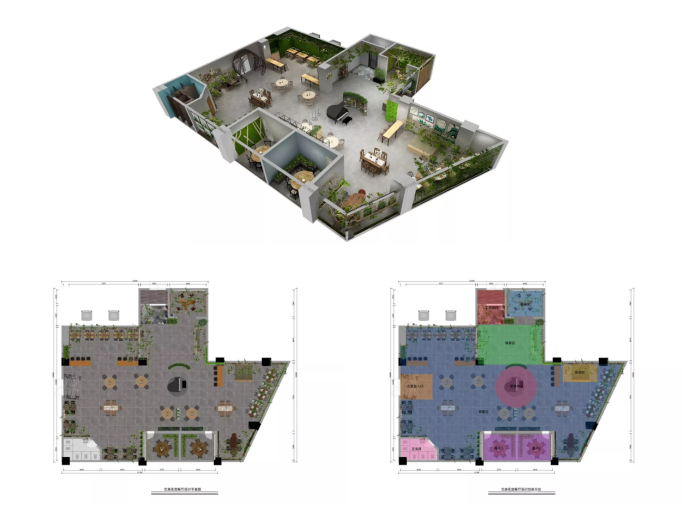 设计说明:整体餐厅以植物包围,与偏灰地面完美融合,仿佛进入森林露营一般。