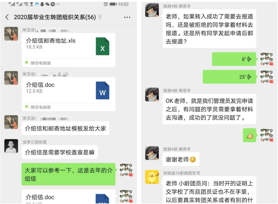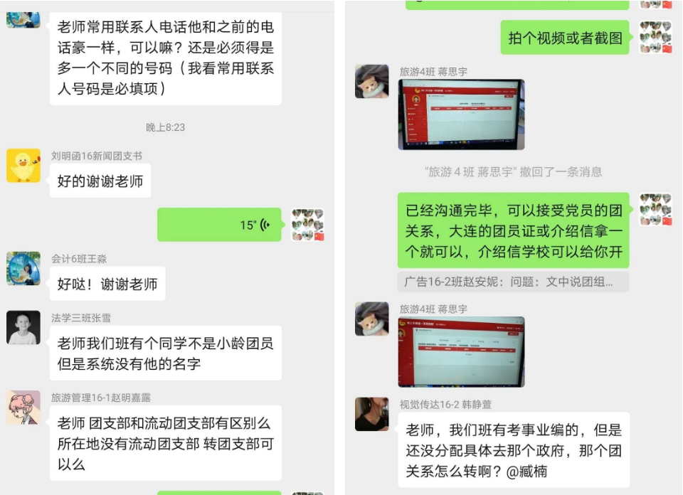 会后,为确保“学社衔接”工作顺利完成,深化线上培训效果,校团委组织建立了“毕业生团组织关系转接工作交流群”。交流群内由宋玉洁老师和毕业班辅导员负责收集、解答各团支部书记在工作中遇到的问题,帮助他们熟练掌握毕业生团组织关系转接工作的各项操作。