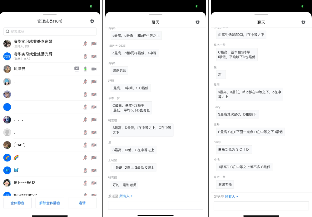 本次线上就业指导活动由就业处李东靖老师主持,活动伊始李东靖老师就疫情期间实习就业现状及未来疫情常态化下的就业机遇做出了详细解读,并引导学生树立乐观、平和、积极向上的新形势下实习就业理念。活动中学生们通过师津锦老师提供的测试题目与就业指导教师展开了有效、充分的交流,并根据学生的个人情况有针对性的做出专业、客观的回复,同时师津锦老师结合学生答题结果做出了指向性讲解,得到了同学们的一致认可。