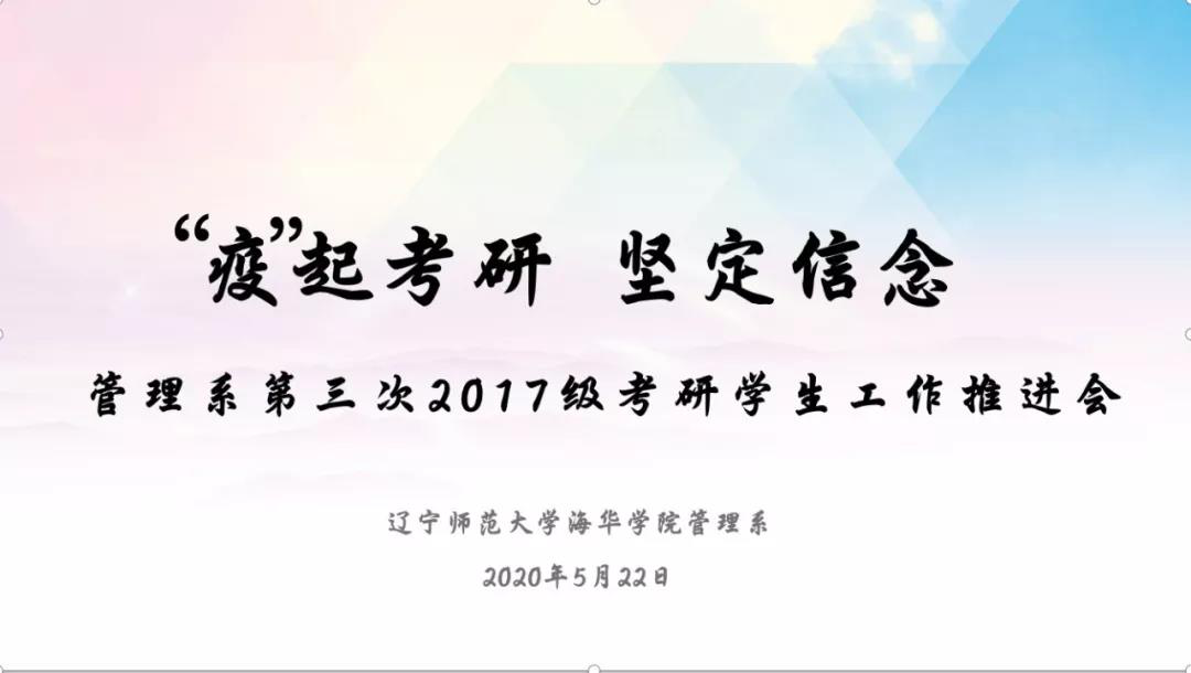 为进一步营造浓郁的考研氛围,充分调动2017级学生考研积极性,帮助学生明确目标、科学规划、顺利考研,5月22日下午15时整,管理系通过“腾讯会议”网络平台顺利召开第三次2017级考研工作推进会。管理系主任栾美晨教授、副主任朱爱辉副教授、系部考研指导教师、全体辅导员及2017级全体考研学生参加本次会议。会议由副主任朱爱辉副教授主持。
