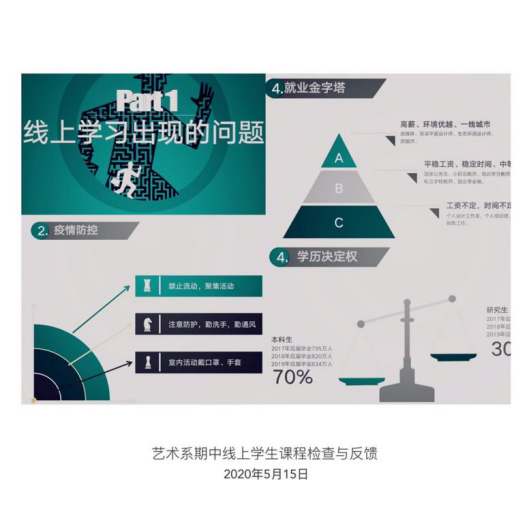 为深入了解在新冠疫情下学生的学习情况,把握本学期学生的思想动态和学习生活等方面的需求,及时发现艺术系线上学习过程中可推广的亮点,解决一些实际存在的问题,加强教学管理、提高网络学习质量,艺术系于5月15日下午13:30通过腾讯会议召开本学期“期中线上学生课程检查与反馈”座谈会。