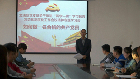 为喜迎十九大,全面深入贯彻党的思想以及强化我院师生的爱党精神,我院文法系党支部组织开展了一堂微党课。并希望通过这次形式新颖的党课激发学生们的主动性和创造性,通过对“如何做一名合格的共产党员”主题的讲解和个人看法的发表,让学生们以小见大、见微知著,从而来达到自我教育和互相教育的目的。此次党课于2017年10月12日下午在第一教学楼527会议室举行,由文法系党支部书记李宁主持,以及文法系党支部宣传委员丛羽、文法系全体学生会干部参与聆听。