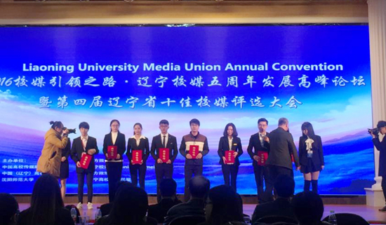 2016年12月3日第三届辽宁高校传媒业务技能大赛颁奖典礼和辽宁校媒五周年发展高峰论坛在沈阳师范大学国际商学院举行。我院文法系杨丽娜教师作为指导教师带领7名同学参加颁奖典礼,并代表我院文法系领取“优秀组织奖”。