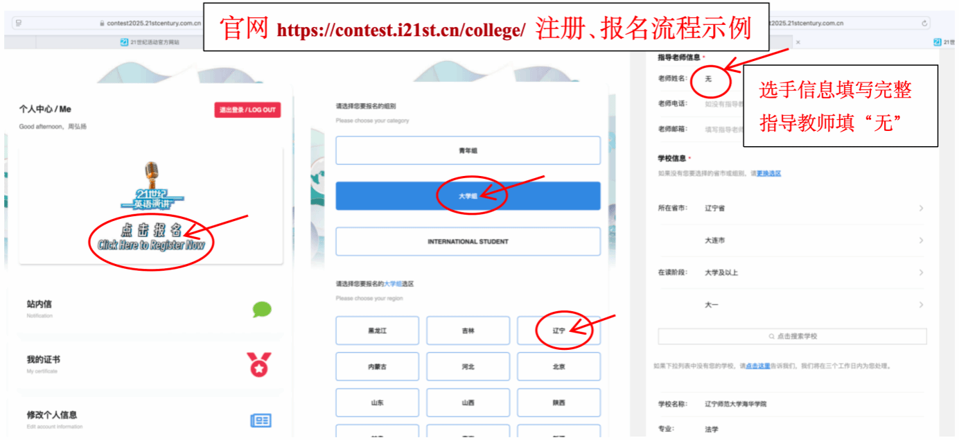3. 在官网完善信息、报名,组别选择“大学组”、赛区“辽宁”。
